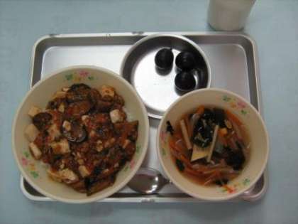 9月27日の給食 公開日 2012/09/27 更新日 2012/09/27 今日の出来事 マーボーナス丼 わかめスープ 巨峰 牛乳 (今日のナスは、八王子産です。ナスの紫色は、アントシアニン系ポリフェノールの一種、ナスニンです。抗酸化パワーがあります。「ナスは嫁に食わすな」と言うと、意地悪そうに聞こえますが、ナスは体を冷やす野菜なので、赤ちゃんを産むお嫁さんが冷えないように気遣う意味もあります。)
