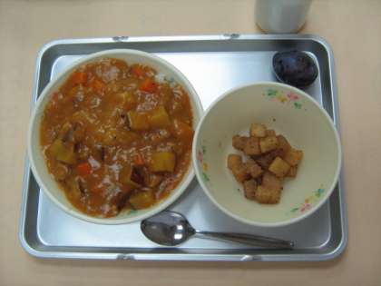10月3日の給食 公開日 2012/10/03 更新日 2012/10/03 今日の出来事 さつまいもとチキンのカレーライス ごま大根 プルーン 牛乳 (今日のカレーライスは、じゃがいもではなく、旬のさつまいもを入れました。じゃがいもより、甘さが増しますね。さつまいもの皮にも大切な栄養があります。今日は、皮つきで入れました。色もきれいです。)