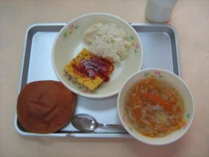 10月19日の給食 公開日 2012/10/19 更新日 2012/10/19 今日の出来事 セルフオムレツサンド マッシュポテト 野菜スープ 牛乳 (パンに、オムレツを挟んで食べます。オムレツは、ハム、たまねぎ、バター、牛乳などを卵に混ぜて焼きました。家庭では、フライパンでふっくら焼きますが、学校では、鉄板に流して焼きました。)