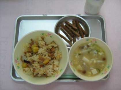 11月15日の給食 公開日 2012/11/15 更新日 2012/11/15 今日の出来事 吹き寄せおこわ 揚げごぼう なめこ汁 牛乳 (ごぼうは、春に種を蒔いて、秋から冬に、その根を収穫します。私たちが食べているのは、ごぼうの根の部分です。この根の部分を食べるのは、日本と韓国だけだそうですが、ヨーロッパでは、葉の部分をサラダとして食べるそうです。)