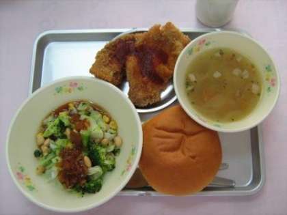 (今日は、主菜のリザーブ給食です。フィッシュフライか、トンカツを選んでもらいました。主菜とは、食事の中心となるおかずで、魚・肉・卵・大豆製品など、たんぱく質が多く含まれる料理です。黄色・赤・緑の3色の食品のうち、赤い食品に分類され、骨や筋肉、血液などをつくります。来月は、副菜のリザーブ給食を予定しています。)