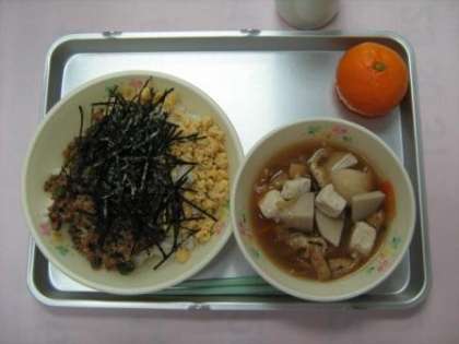 11月30日の給食 公開日 2012/11/30 更新日 2012/11/30 今日の出来事 鶏そぼろごはん けんちん汁 みかん 牛乳 (けんちん汁は、建長寺の修行僧がつくっていたため、「建長汁」がなまって「けんちん汁」になったと言われています。もともと、精進料理なので、肉などの動物性の食品は入らず、出し汁も鰹節や煮干しではなく、昆布と椎茸から取ったものを使っていたそうです。今では、肉が入り、鰹節や煮干しから出しをとったものが食べられています。)