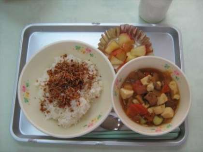 12月7日の給食 公開日 2012/12/07 更新日 2012/12/07 今日の出来事 きびご飯 ふりかけ 豆腐のカレー煮 焼きリンゴ 牛乳 (焼きリンゴは、アルミカップに、リンゴ、砂糖、バター、レモン汁を入れて焼きました。甘酸っぱいリンゴの香りがおいしいです。)