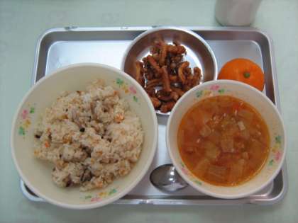 12月14日の給食 公開日 2012/12/14 更新日 2012/12/14 今日の出来事 きのこピラフ イカのカリント揚げ ミネストローネスープ みかん 牛乳 (イカは、エネルギー量が少なく、高たんぱくで、頭の働きをよくするDHAや、血液をサラサラにしてくれるEPAが含まれます。体によいですので、苦手な人も、できるだけ食べるようにして欲しいです。)