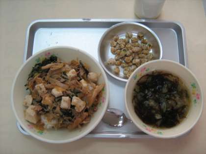 1月15日の給食 公開日 2013/01/15 更新日 2013/01/15 今日の出来事 豚すき丼 もずくスープ ポップビーンズ 牛乳 (大豆は畑の肉と言われるように、たんぱくしつ、カルシウムなどの栄養がバランスよく含まれ、食物繊維も豊富です。悪玉コレステロールを減らし、善玉コレステロールを増やす効果もあります。よくかんで食べましょう。)