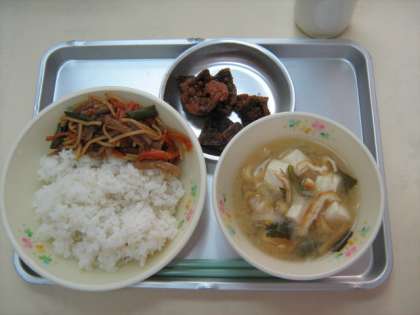 (学校給食週間の4日目です。今日は、給食の目的のひとつ、正しい食習慣を身につける、ということについてお話します。正しい食習慣と言うと、幅広い意味ですが、まずは、3度の食事を規則正しく食べ、好き嫌いせず、バランスよく食べることが基本です。特に、成長期には、朝ごはんが大切です。朝ごはんをしっかり食べると、脳や体が活発に働き、勉強や運動を頑張ることができます。今日は、昔の給食で出されていた鯨を使ったから揚げです。)