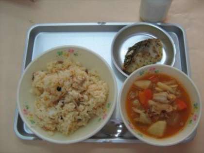 (世界三大スープに数えられるボルシチは、ロシア料理の定番、というイメージですが、実はウクライナが発祥のスープ料理です。ウクライナは、旧ソ連からのグルメの宝庫だったようです。ボルシチは、スラブ語で赤カブのビーツの意味で、このビーツを入れるのが、本来のボルシチの条件だそうです。学校では、ビーツを手に入れるのが難しいので、トマトピューレで赤い色を出しました。)