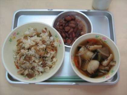 2月25日の給食 公開日 2013/02/25 更新日 2013/02/25 今日の出来事 とりごぼうごはん きりたんぽ汁 金時豆の甘煮 牛乳 (今日のきりたんぽは、秋田県の代表的な郷土料理です。ごはんをつぶし、木の棒にまぶしつけ、焼いたものです。今日は、秋田の郷土料理「きりたんぽ」を味わって食べましょう。)
