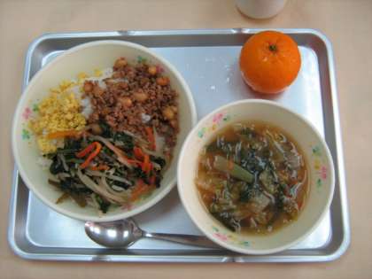 2月28日の給食 公開日 2013/02/28 更新日 2013/02/28 今日の出来事 ビビンバ キムチスープ ポンカン 牛乳 (キムチは、韓国の代表的なつけもので、白菜やにんじん、にんにく、アミエビ、くだもの、とうがらしなど、韓国では、各家庭で、入れるものがちがいます。乳酸の酸味も、おいしさのひとつです。)