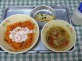 19日のこんだては、チキンライスのホワイトソースかけ・イカのハーブ焼き・野菜スープ・果物(キヨミオレンジ)・牛乳でした。