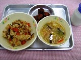 17日のこんだては、五目おこわ・鰹のかりんと揚げ・えび団子スープ・牛乳でした。