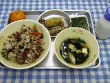14日のこんだては、かやくごはん・ちくわとししゃもの二色揚げ・湯葉のすまし汁・くだもの(冷凍みかん)・牛乳です。