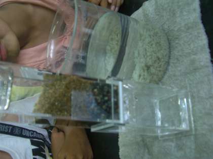 蛇口をひねったら当たり前のように出てくる水は、どのような工程で飲めるようになっているのかの説明を聞いた後、オゾンでにおいを処理する仕組みを見て、「沈殿→ろ過」の実験を行いました。