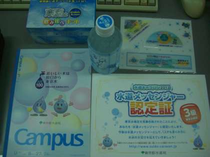最後に、東京水検定3級の問題を解き、「水道メッセンジャー認定証」と東京の水道水飲み比べキット、キャンパスノート、定規セットをいただきました。