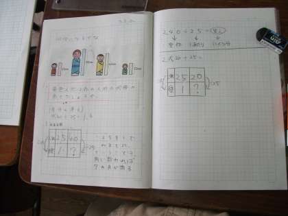 今日の研究授業は、何倍になるのかを求める授業でした。(2)の問題では、小数も出てきましたが、子供たちは4マス図などを使い、集中して問題に取り組みました。