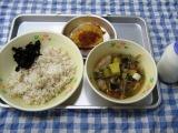 18日のこんだては、ごまごはん・おろしハンバーグ・わかめのにんにく炒め・さつま汁・牛乳です。