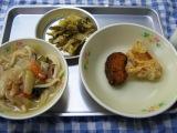 19日のこんだては、味噌煮込みうどん・天ぷら(いか・かぼちゃ)・キャベツのピリ辛炒め・牛乳です。