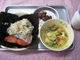 24日のこんだては、セルフおにぎり・鮭の塩焼き・かきたま汁・金時豆の甘煮・牛乳です。