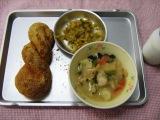 28日のこんだては、きなこ揚げパン・みそすいとん・キャベツの生姜風味・牛乳です。