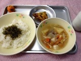 16日のこんだては、ごはん・青のりふりかけ・千草焼き・豚汁・くだもの(びわ)・牛乳です。