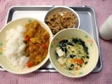 1日のこんだては、チキンカレーライス・たまごスープ・大根ごまサラダ・牛乳です。