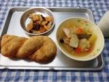 4日のこんだては、きなこ揚げパン・野菜のスープ煮・魚介とナッツの炒め物・牛乳です。