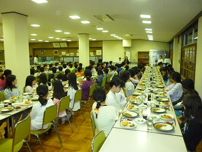 バスに乗ってお世話になる少年自然の家へ。お腹も減っておいしい夕食です。片づけも協力して行いました。