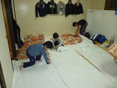 夕飯が終わったらキャンプファイヤーです。みんなで歌ったり踊ったり、楽しい時間を過ごしました!部屋に戻ったら、就寝準備です。みんなで協力して布団をしきます。