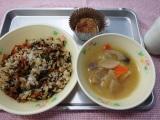 14日のこんだては、ひじきごはん・ウズラの玉子入りミートボール・田舎汁・牛乳です。