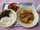 6日のこんだては、ごはん・茎わかめの炒り煮・いかのかりんと揚げ・肉じゃが・牛乳です。