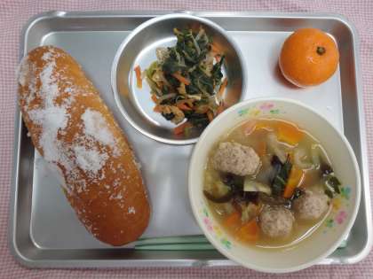 1月27日の給食 公開日 2016/01/28 更新日 2016/01/28 今日の出来事 <こんだて> あげパン にくだんごスープ ほうれんそうのにびたし くだもの(みかん) ぎゅうにゅう 学校給食週間の3日目です。 戦後は、アメリカからの援助物資による給食で、主食はコッペパンでした。揚げパンなどの調理したパンがでるようになったのは、今から約50年前です。揚げパンは、昔から大人気!パンを油で揚げて、さとうやきなこをまぶします。今日は、昔ながらのコッペのさとう揚げパンです。