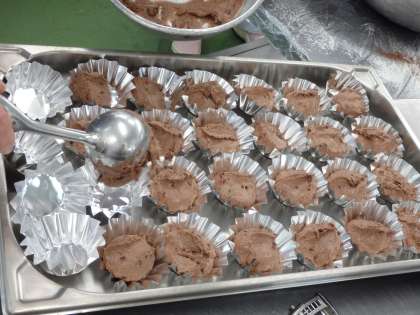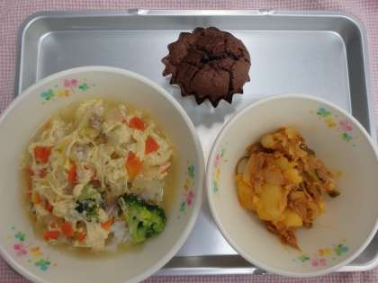 2月14日はバレンタインデーです。もとはキリスト教の記念日で、恋人たちが愛を誓う日です。日本では女性から男性へチョコレートを贈るイベントになっていますが、海外では家族や友達などに感謝の気持ちをこめて花やカード、お菓子を贈ります。今日は、元気いっぱいのみなさんに、給食室から心を込めてミニチョコケーキをつくりました。