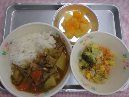 2月23日の給食 公開日 2016/02/23 更新日 2016/02/23 今日の出来事 <こんだて> こんさいカレーライス フレンチサラダ くだもの(フルーツかん) のむヨーグルト 今日は縦割り交流給食です。6年生に感謝の気持ちをこめて、楽しく会食しましょう。 今日のカレーは、れんこんやごぼうが入った、こんさいカレーです。根菜は土の下にできる野菜で、体を温めてくれます。