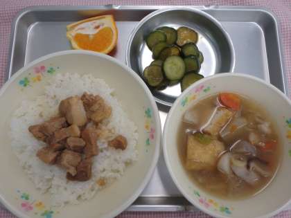 2月25日の給食 公開日 2016/02/25 更新日 2016/02/25 今日の出来事 <こんだて> ぶたのかくにどんぶり のっぺいじる ピリカラきゅうり くだもの(いよかん) ぎゅうにゅう かくには、3-3のリクエストです。今日はコロコロの角煮をごはんにのせて食べます。 豚肉には、ビタミンB1という栄養がたくさん含まれています。牛肉のなんと10倍!ビタミンB1は、食べたものが体の中でエネルギーが変わるために必要な栄養素です。体の疲れをとってくれます。