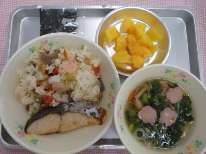 明日3月3日はひな祭りです。女の子の健やかな成長と幸せを願ってお祝いする行事で「桃の節句」とも呼ばれます。今日は1日早く、ひな祭り献立です。ちらしずしは、縁起の良いえび(長生きする)・れんこん(先を見通す)などを使って、春らしい鮮やかな彩りが女の子の節句にピッタリですね。おすいものには、梅の形のかまぼこを入れました。
