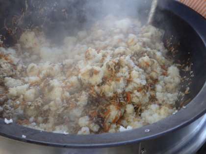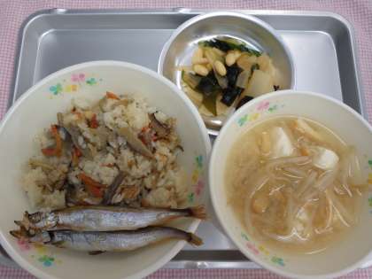 丹治さんからのメッセージ・・・かやくごはんは、ふつうのごはんと違い、具が入っているので栄養たっぷりです。わかめサラダで野菜もとれます。これでバランス献立が完成!