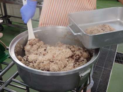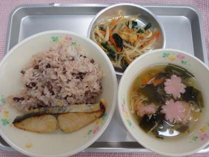 入学式・始業式から10日たちました。1年生も昨日から給食が始まったので、今日はみなさんの入学・進級をお祝いした、春らしい献立です。お赤飯は、いろいろなお祝いのときに食べますね。そして、今日の魚のさわらは、漢字で書くと魚へんに春と書くきます。春がついている通りに春が旬の魚です。すましじるには、桜の形のかまぼこをいれました。