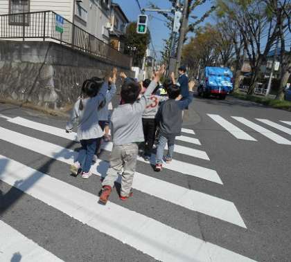 歩道を歩くときは建物側を歩くこと、横断歩道の渡り方等を丁寧に教えていただき、実際に学校の周りを歩いてみました。右を見て、左を見て、もう一度右を見て、手を真っ直ぐピンと挙げて渡ることができました。