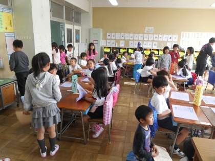 学校探検の際に使うワークシートを持って教室に入ってきてくれた2年生。まだ平仮名の学習を終えていない1年生のために2年生がきれいに同じチームの友達の名前を書いてくれました。自己紹介では、2年生が最初に大きな声で自己紹介をし、お手本を見せてくれました。1年生は、お兄さんお姉さんの前での自己紹介に緊張した様子でしたが、思い切って自己紹介をすることができました。