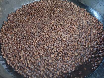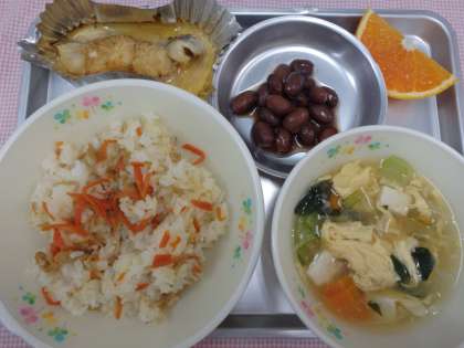 今日は、赤紫色の金時豆を甘く煮ました。いんげん豆は種類がたくさんあります。今日の金時豆の他に、真っ白な白いんげん豆、とら模様のとら豆、うずらの卵のようなうずら豆、大きな花豆など色や大きさがさまざまです。豆は日本で昔から食べられてきた食品です。みなさんに日本の食を受け継いでほしいと願い、給食では豆をよく使います。小皿に少しの量なので、苦手な人も完食を目指してみましょう!