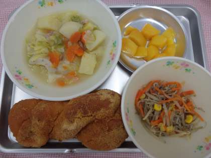 5月6日の給食 公開日 2016/05/09 更新日 2016/05/09 今日の出来事 <こんだて> きなこあげパン やさいのスープに じゃこサラダ くだもの(ももかん) ぎゅうにゅう 昔、給食で出るパンはコッペパンだけでした。昭和30年代の終わりごろからあげパンなどの調理したパンが給食ででるようになりました。いつでも大人気です。あげパンは、パンを油で揚げてお砂糖やきな粉をまぶしたものです。今日のあげパンは、砂糖ときなこをまぜたきな粉あげパンです。