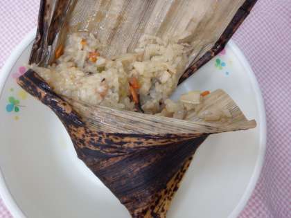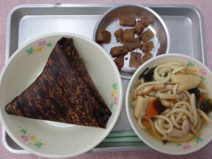 5月5日はこどもの日ですね。たんごの節句ともいいます。この日は「ちまき」や「かしわもち」を食べます。ちまきは中国生まれの食べ物ですが、かしわもちは日本生まれの食べ物です。給食では、中華ちまきを作りました。ひとつひとつ竹の皮でつつんで作った手作りです。