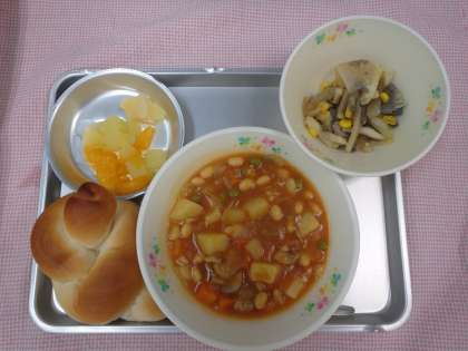 チキンビーンズに入っている豆は大豆です。大豆は栄養豊富で、体をつくったり、動かしたりする働きがあり、「畑の肉」といわれています。おなかの調子を整える働きもあり、さらに、記憶力を高めるともいわれています。豆は苦手な人が多いですが、体にいいことづくしの大豆です。しっかり食べてくださいね。