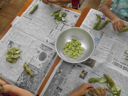翌日8日の給食に、自分たちがむいたそら豆が出て、とても嬉しそうでした。苦手な子も頑張って食べていました。