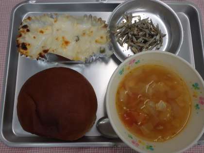 ミネストローネは「具だくさん」という意味のイタリアの家庭料理です。給食のミネストローネにもベーコン・いんげん豆・玉ねぎ・キャベツ・にんじん・セロリ・トマト・・と、具だくさんです。野菜のうまみや甘みがたっぷりでています。