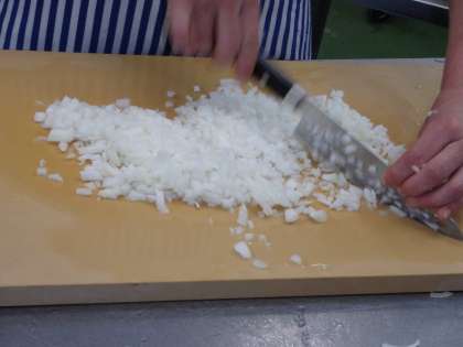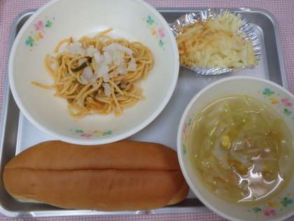 「はちナポ」といわれる八王子ナポリタンは、八王子のご当地グルメです。八王子ナポリタンの特徴は、きざみたまねぎがのっていることと、八王子でとれた食材を使っていることです。八王子には大学がたくさんあり、学生さんがたくさんいます。「安くておなかいっぱいたべてもらいたい」という思いでうまれたメニューです。今日は八王子ナポリタンをパンにはさんでたべます。