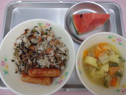 6月27日の給食 公開日 2016/06/29 更新日 2016/06/29 今日の出来事 <こんだて> ひじきピラフ やさいのカレースープに ウインナーケチャップあえ くだもの(すいか) ぎゅうにゅう すいかはウリ科の植物で、きゅうりやメロン・かぼちゃなどの仲間です。英語では「ウォーターメロン」というように、90%以上が水分で、体の熱を冷ます働きがあります。夏の暑いときには、すいかを食べて水分補給をするのもいいですね。
