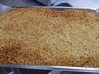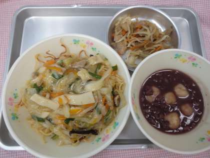 今日は、長崎県の郷土料理献立です。「皿うどん」は、長崎ちゃんぽんと同じ具に、とろみをつけてめんの上にかけた料理です。めんはパリパリの細麺と炒めて作る太麺の2種類があります。今日はオーブンで表面が少しカリッとするくらい焼きました。「うらかみそぼろ」の「そぼろ」とは、方言で千切りの油いためのことで、代々受け継がれてきた家庭料理です。長崎の郷土料理に、「卓袱料理」があります。卓袱料理は、みんなで丸いテーブルを囲んで大皿に盛られた料理を分け合うスタイルでいただきます。中国やオランダ・ポルトガルなど様々な国と交流があった長崎ならではの食文化です。卓袱料理の最後には、「梅椀」と呼ばれる甘い「しるこ」を食べます。