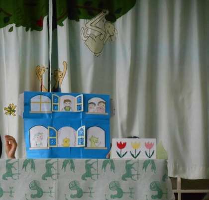 今回は、「そらいろのたね」というお話をペープサートにして紹介していただきました。子供たちは、窓のしかけに「わ〜!」と喜んで見ていました。効果音を使いながらの、お母さんたちの上手な読み聞かせを集中して聞いていました。