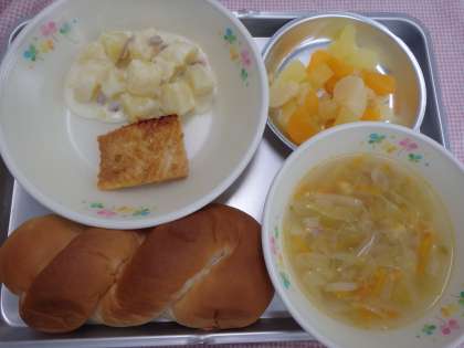 7月13日の給食 公開日 2016/07/19 更新日 2016/07/19 今日の出来事 <こんだて> ねじりパン いかのタンドリーやき ポテトカルボナーラ やさいスープ くだもの(フルーツかん) ぎゅうにゅう カルボナーラは、卵と生クリームで作る料理ですが、今日の給食のポテトカルボナーラは、卵は使わずに生クリームと牛乳と粉チーズで作りました。中学校給食にもでているメニューです。レシピを載せましたので、ご家庭でも作ってみてください。 ポテトカルボナーラ